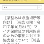あはき施術所マイナ保険証の利用促進のための取組に対する 協力金についての報告期限が令和7年10月31日まで延長されました。 協力金50000円が支給されます。 まだ、申請されてない方がおりましたらまだ間に合うので申請して […]